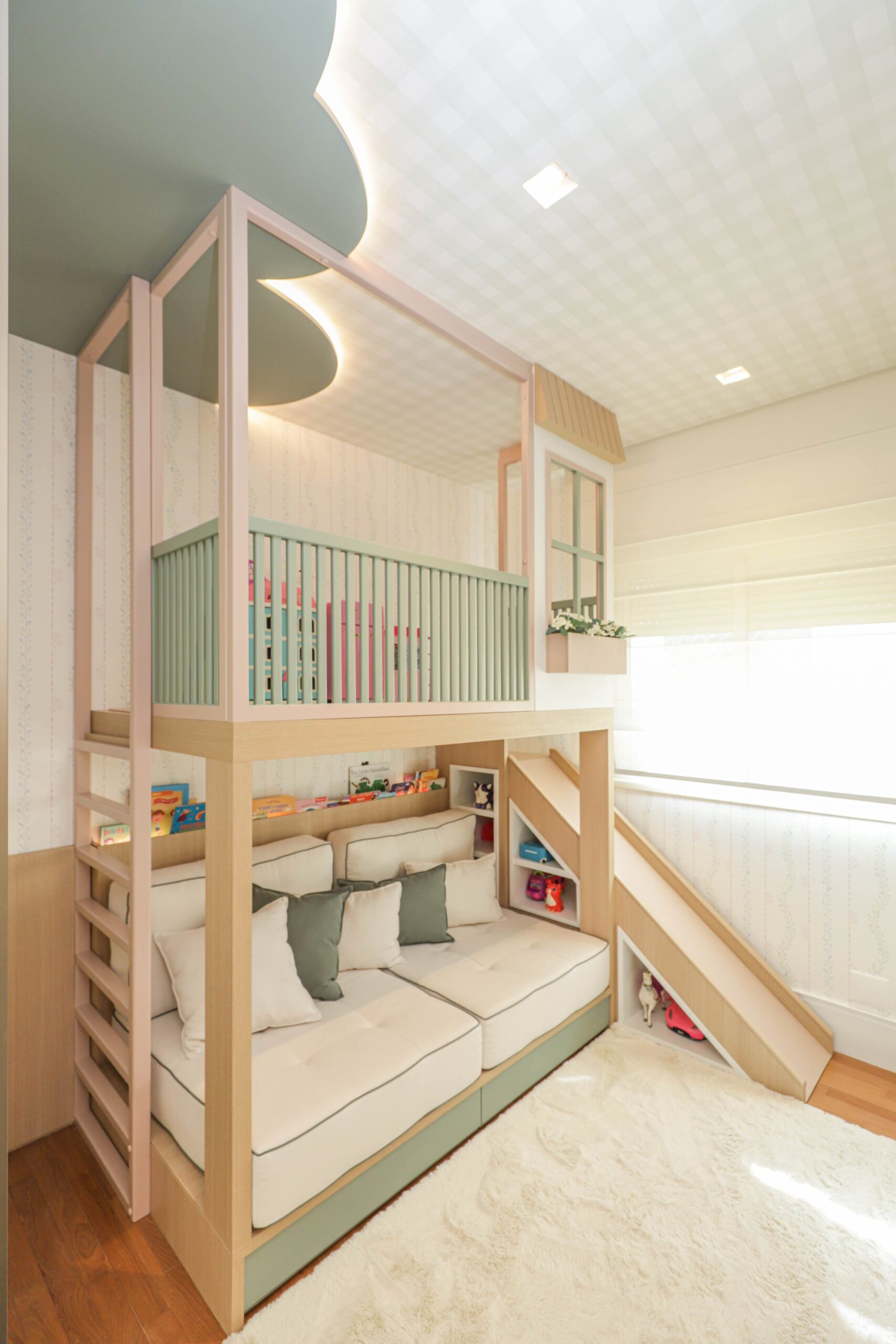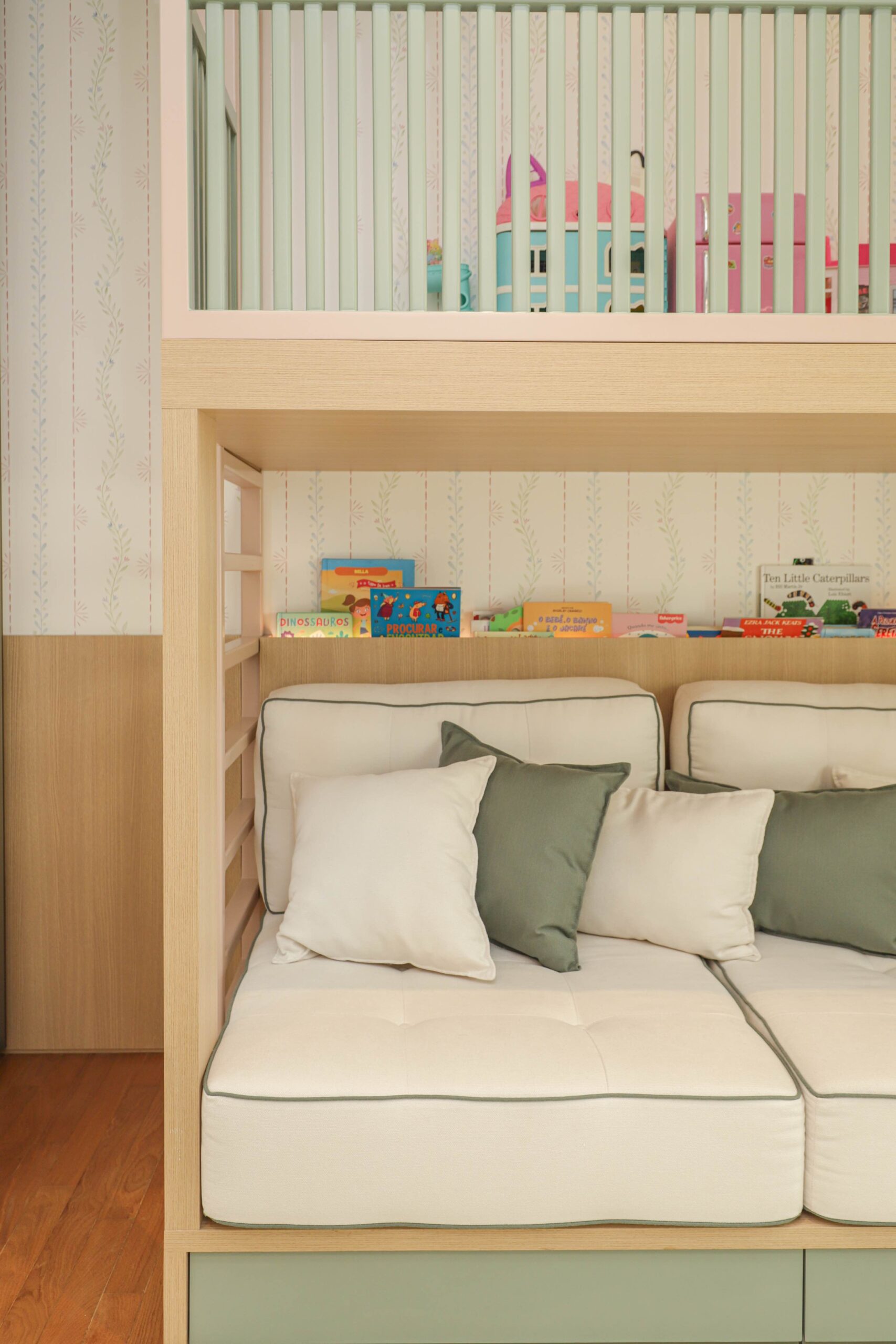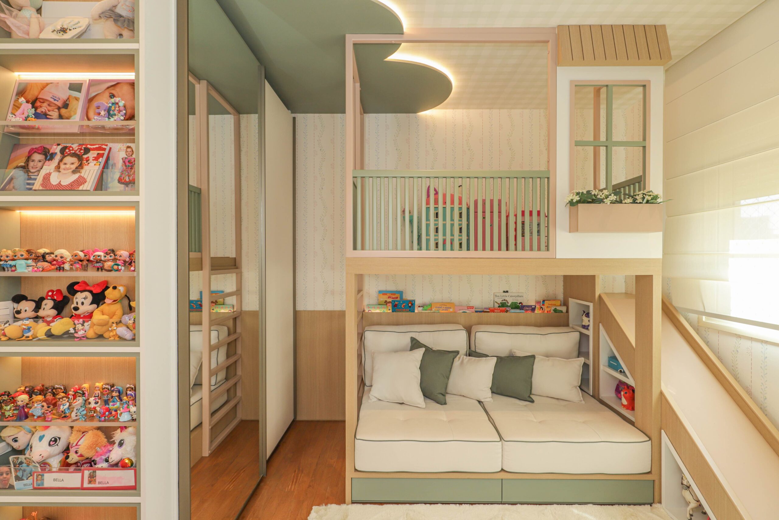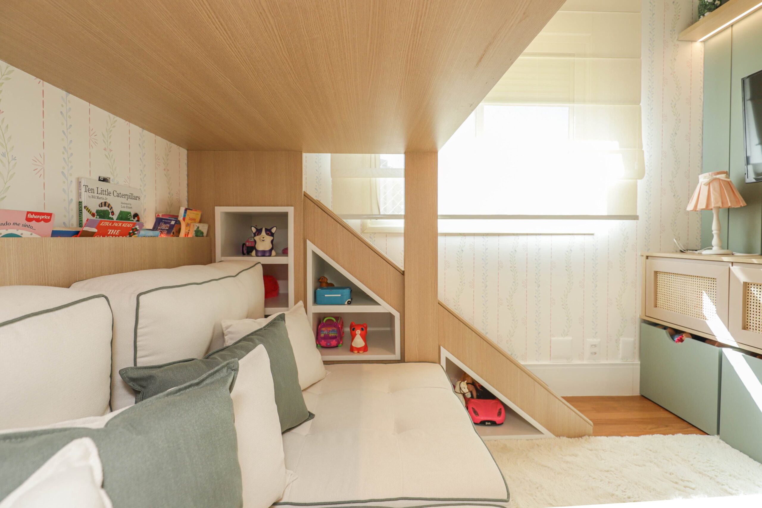 O espaço foi dividido em áreas cuidadosamente planejadas. A estrutura com mezanino traz um toque lúdico e oferece uma área elevada para brincadeiras mais tranquilas ou momentos de imaginação criativa. O cantinho inferior foi projetado para ser um confortável espaço de descanso,