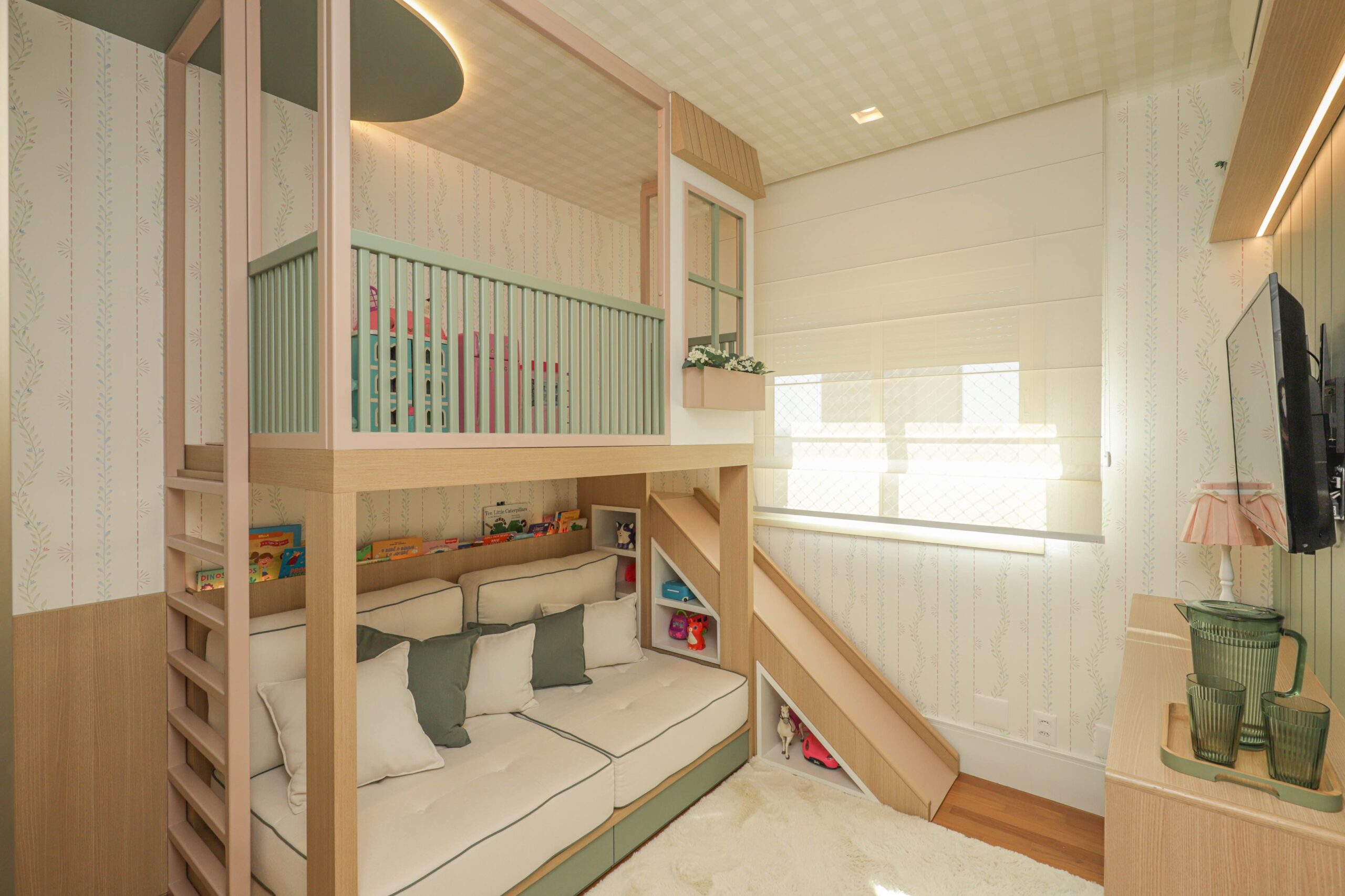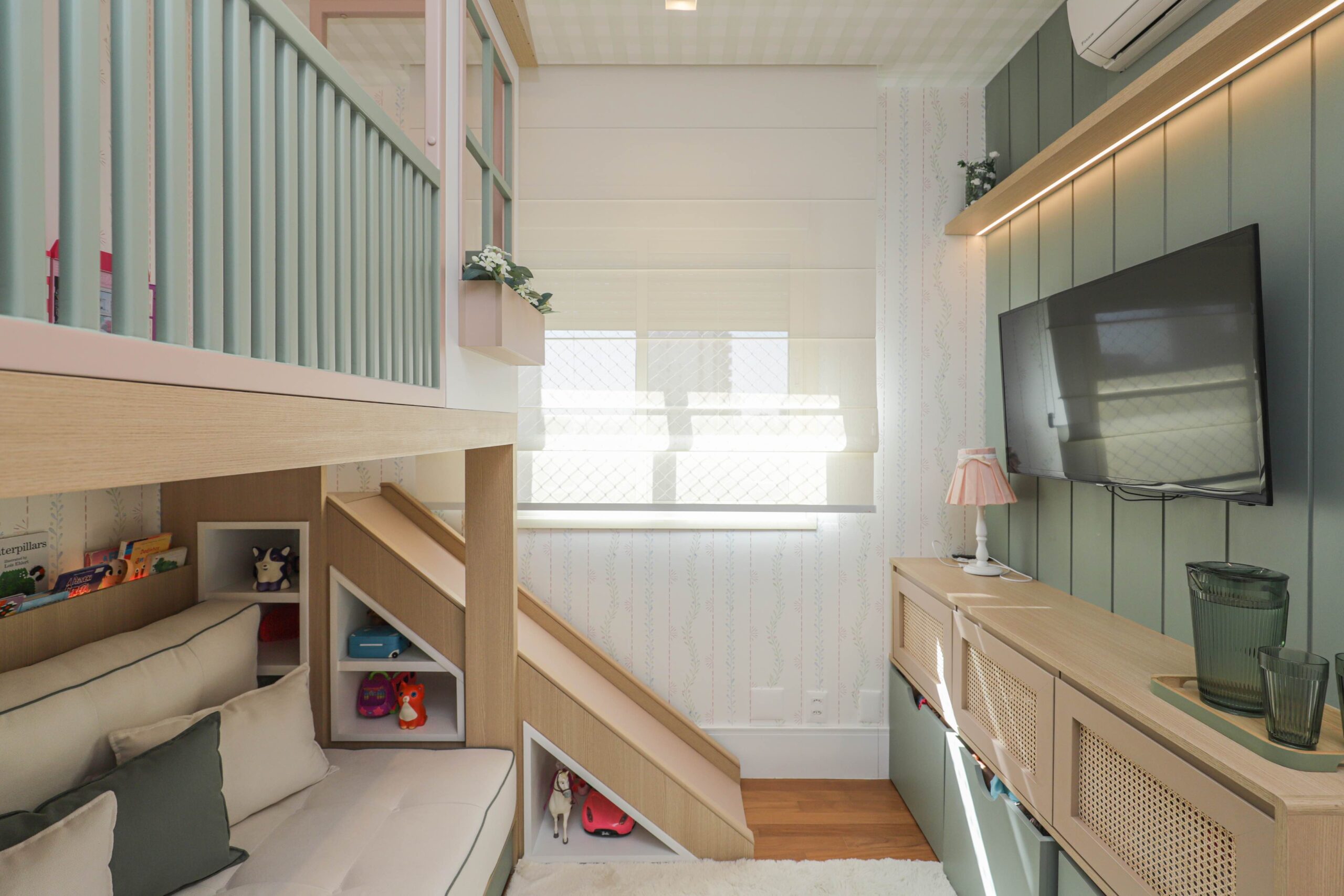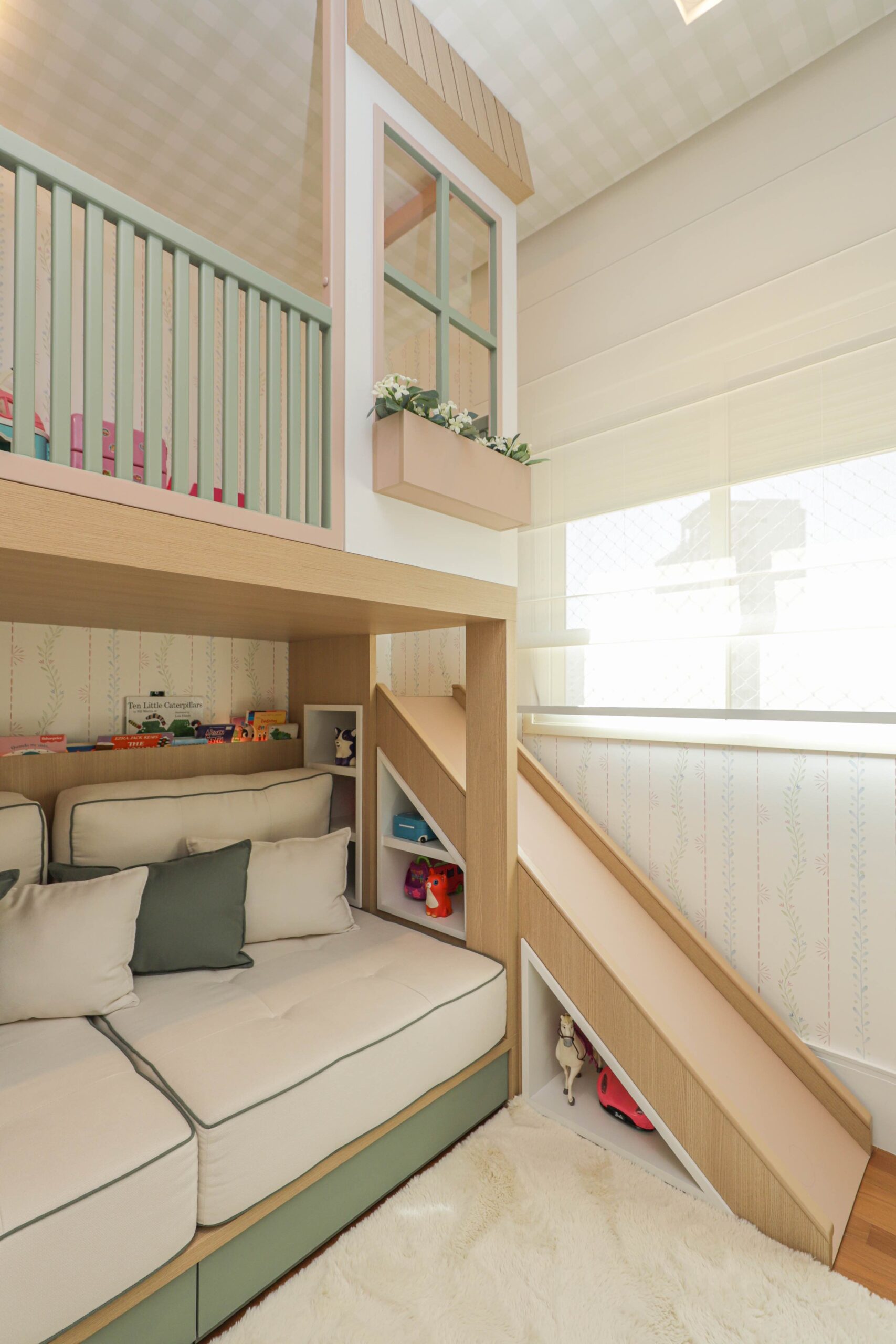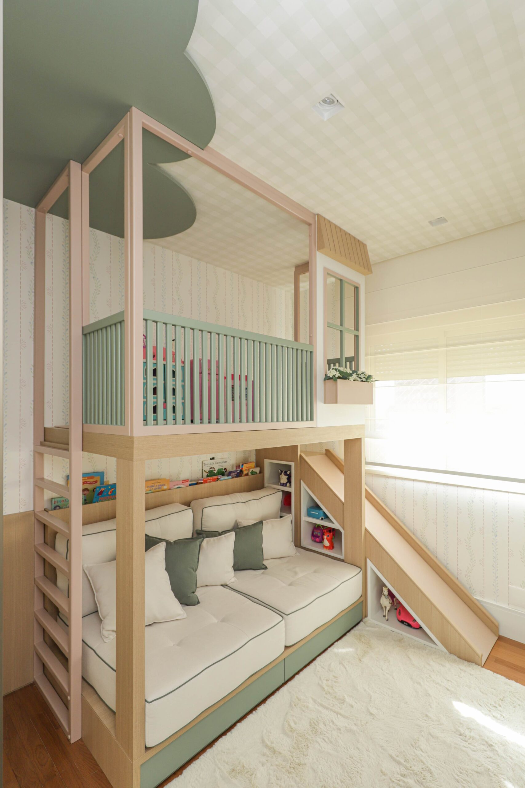 O espaço foi dividido em áreas cuidadosamente planejadas. A estrutura com mezanino traz um toque lúdico e oferece uma área elevada para brincadeiras mais tranquilas ou momentos de imaginação criativa. O cantinho inferior foi projetado para ser um confortável espaço de descanso,
