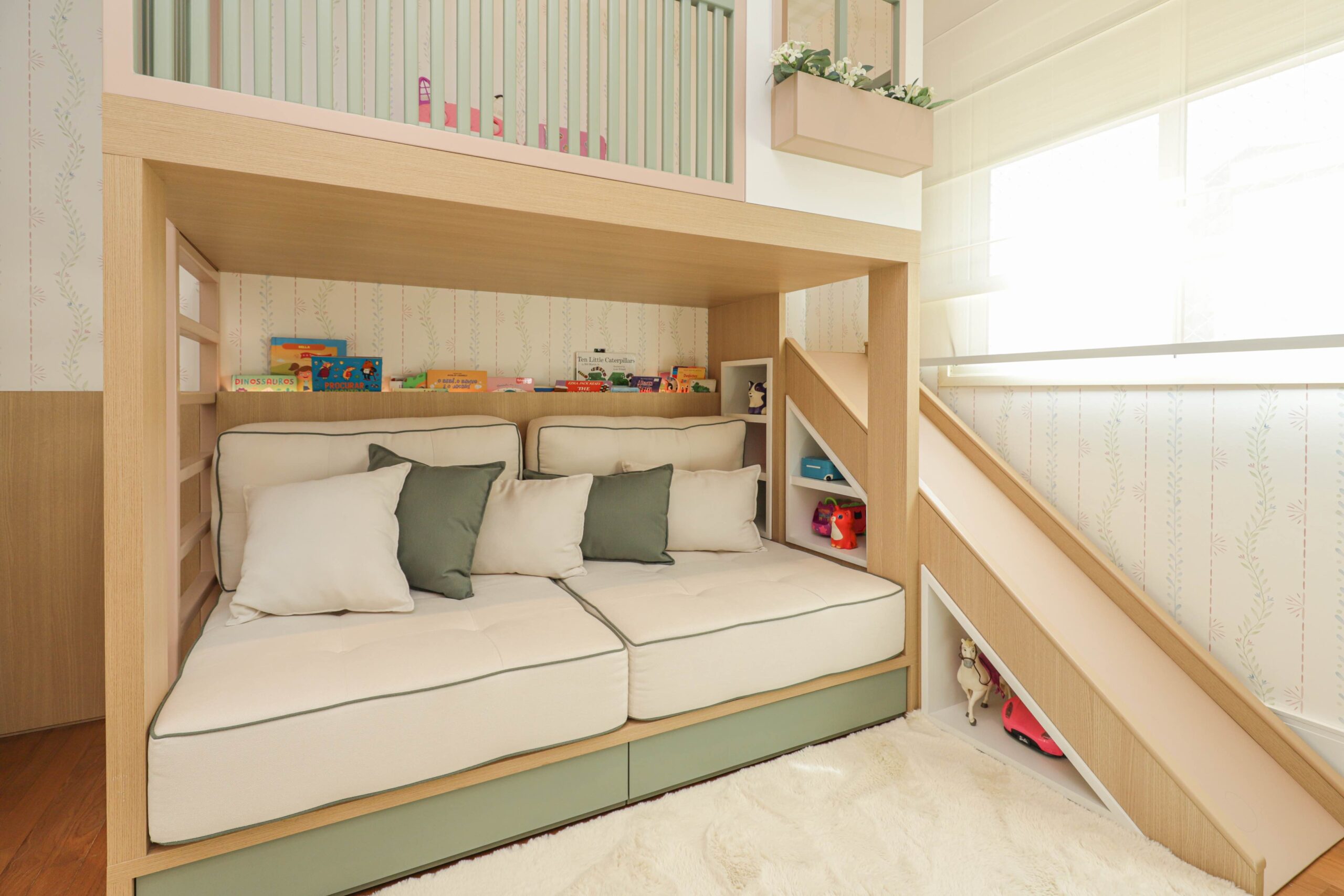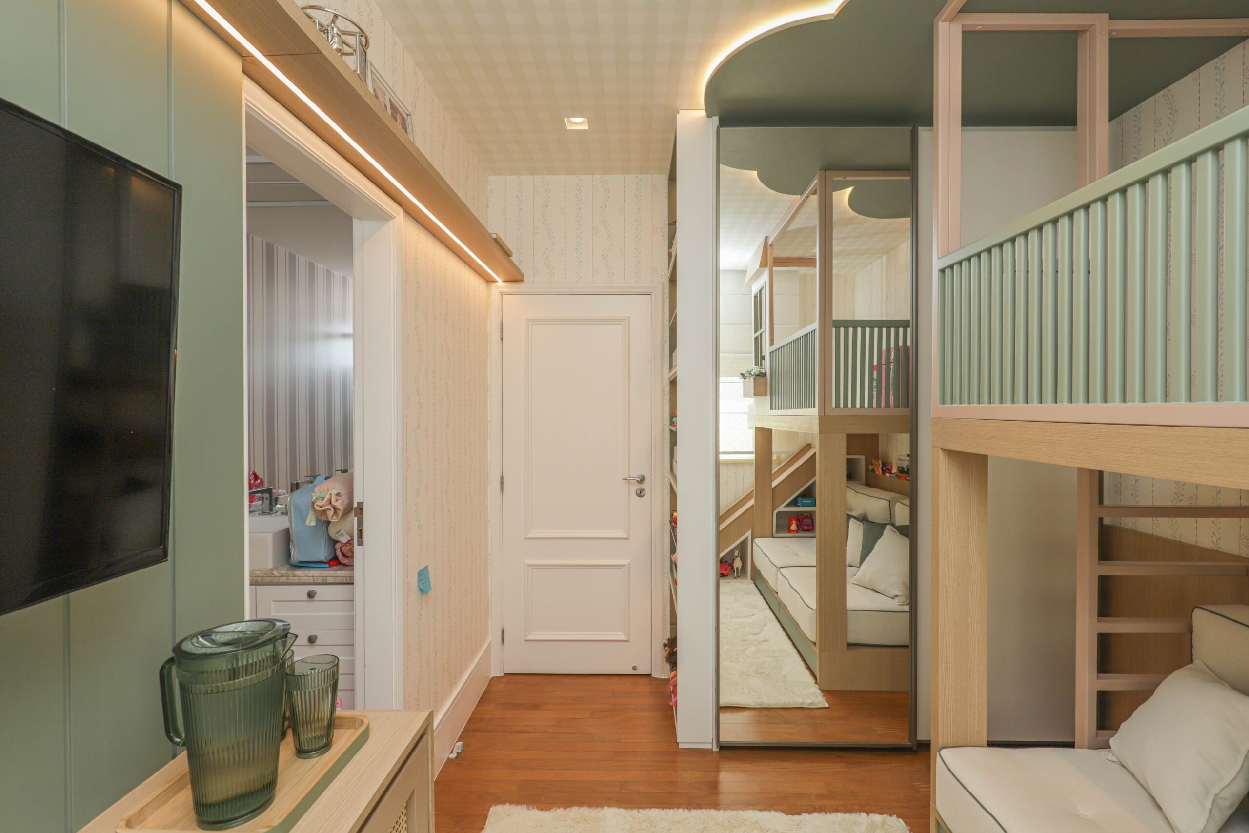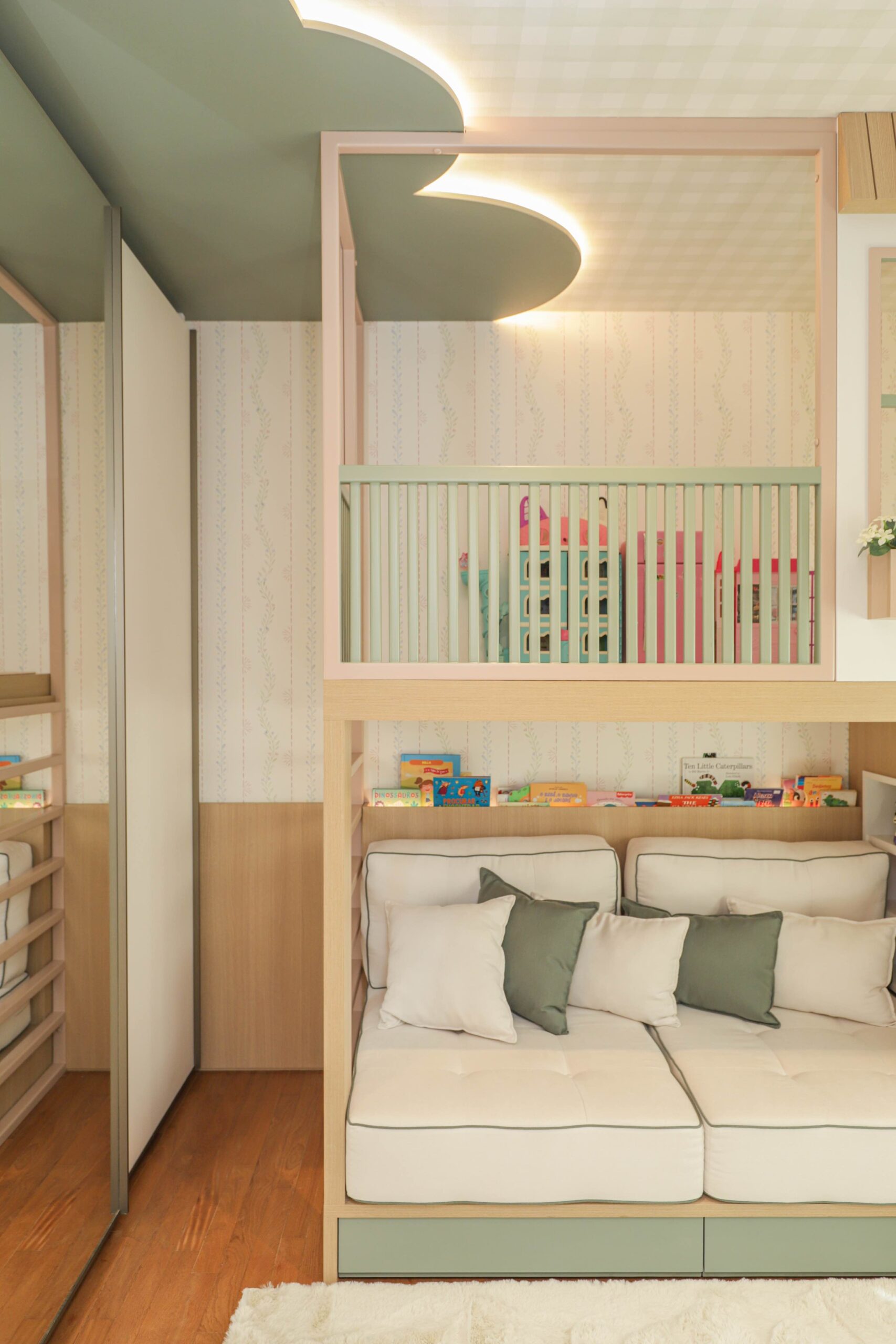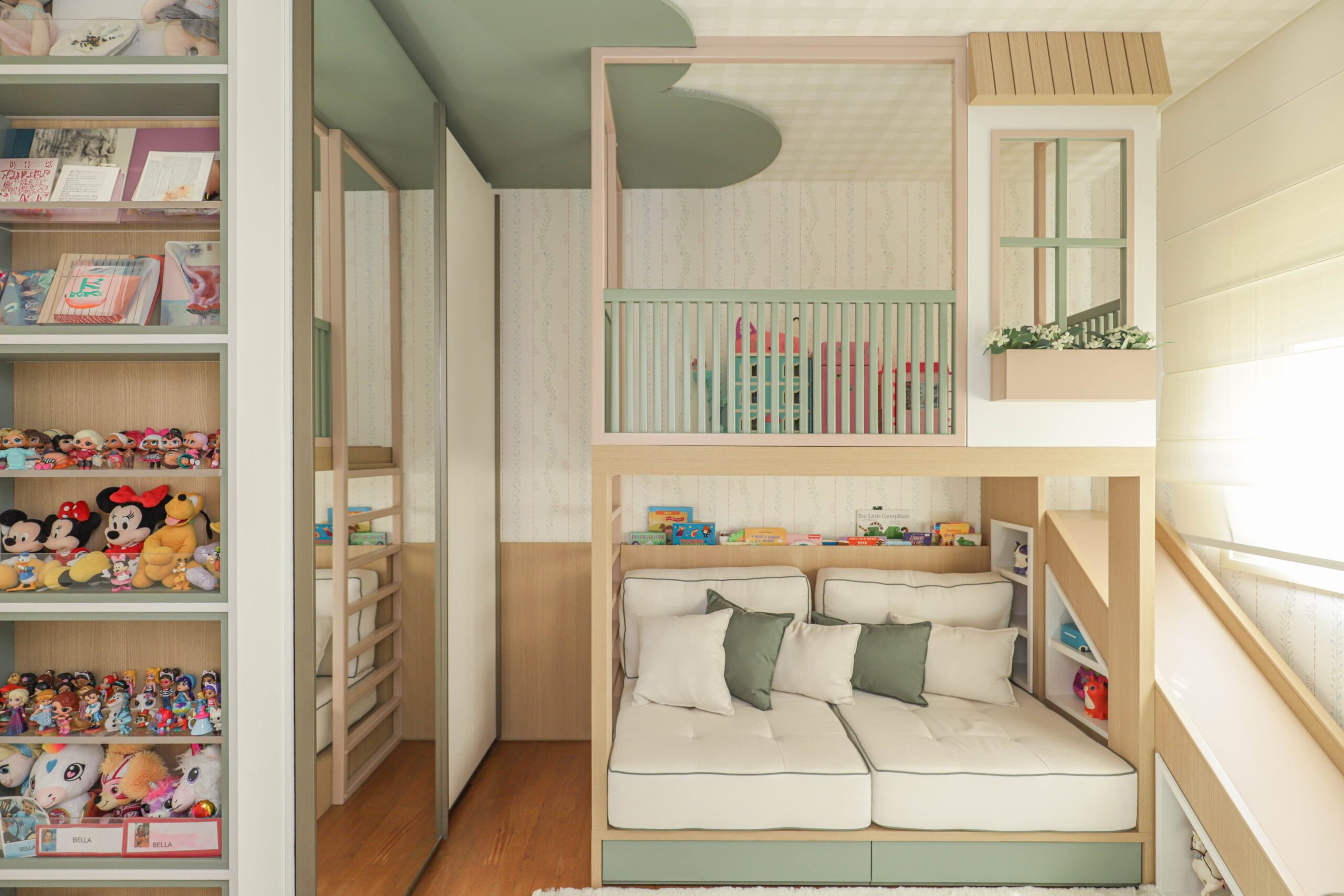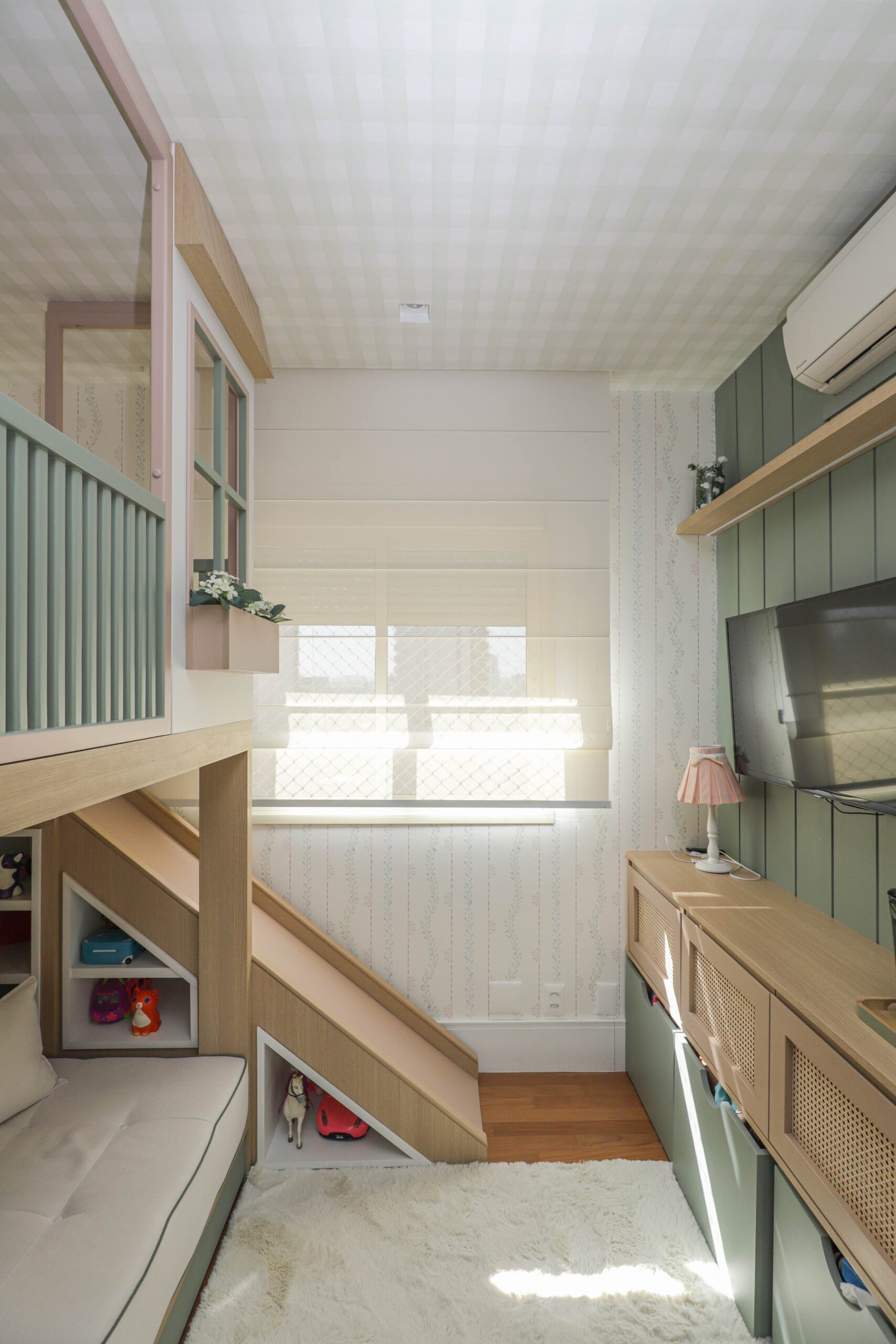 O espaço foi dividido em áreas cuidadosamente planejadas. A estrutura com mezanino traz um toque lúdico e oferece uma área elevada para brincadeiras mais tranquilas ou momentos de imaginação criativa. O cantinho inferior foi projetado para ser um confortável espaço de descanso,