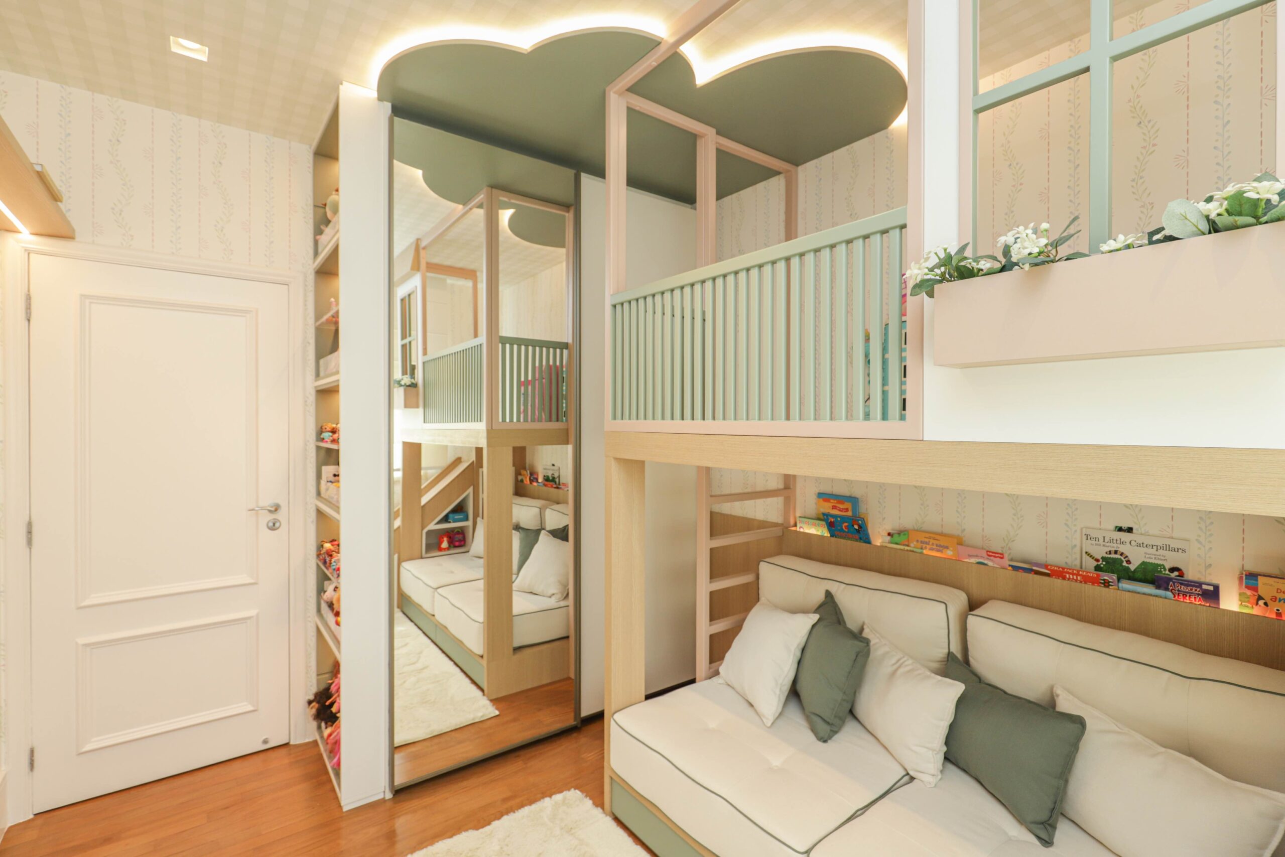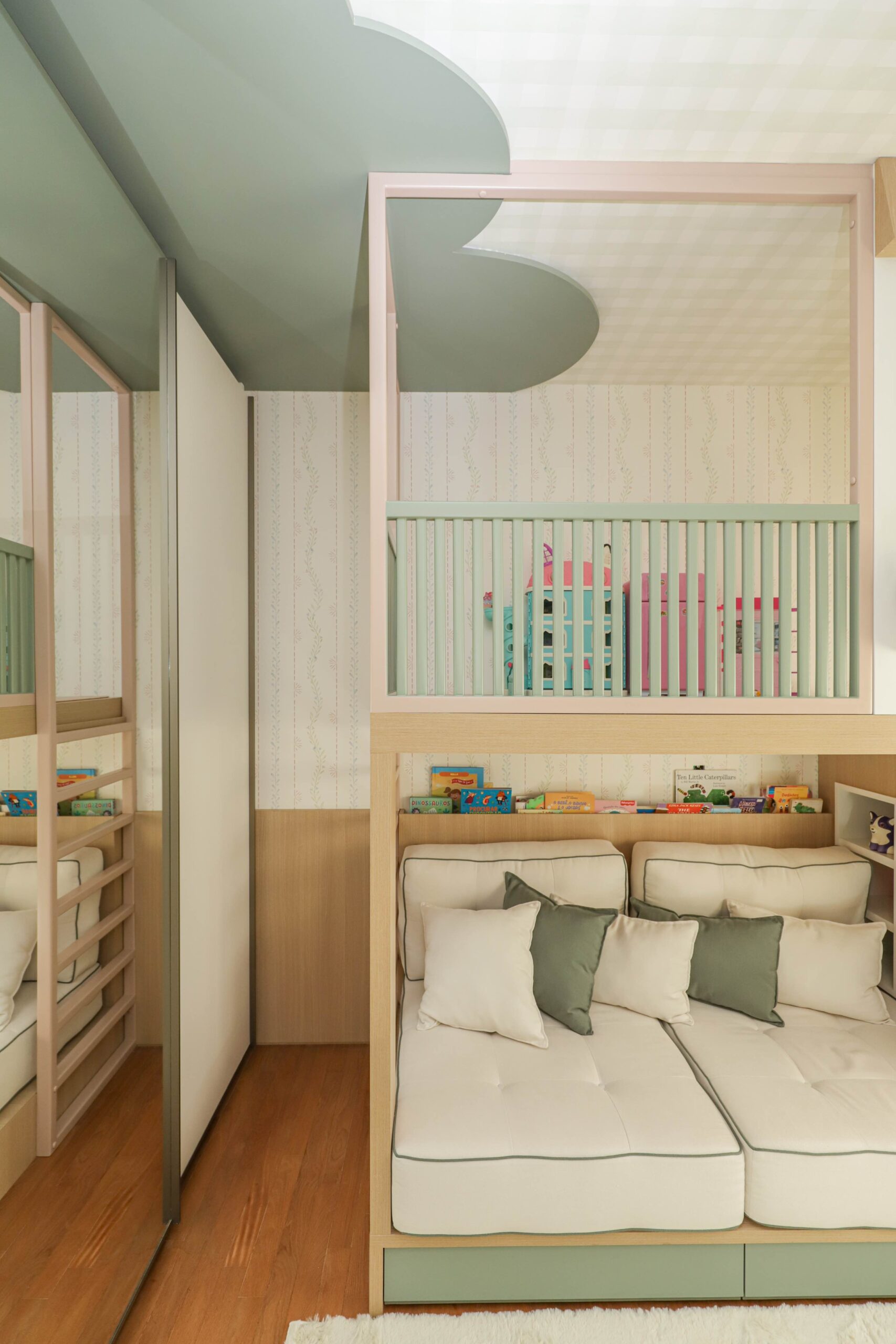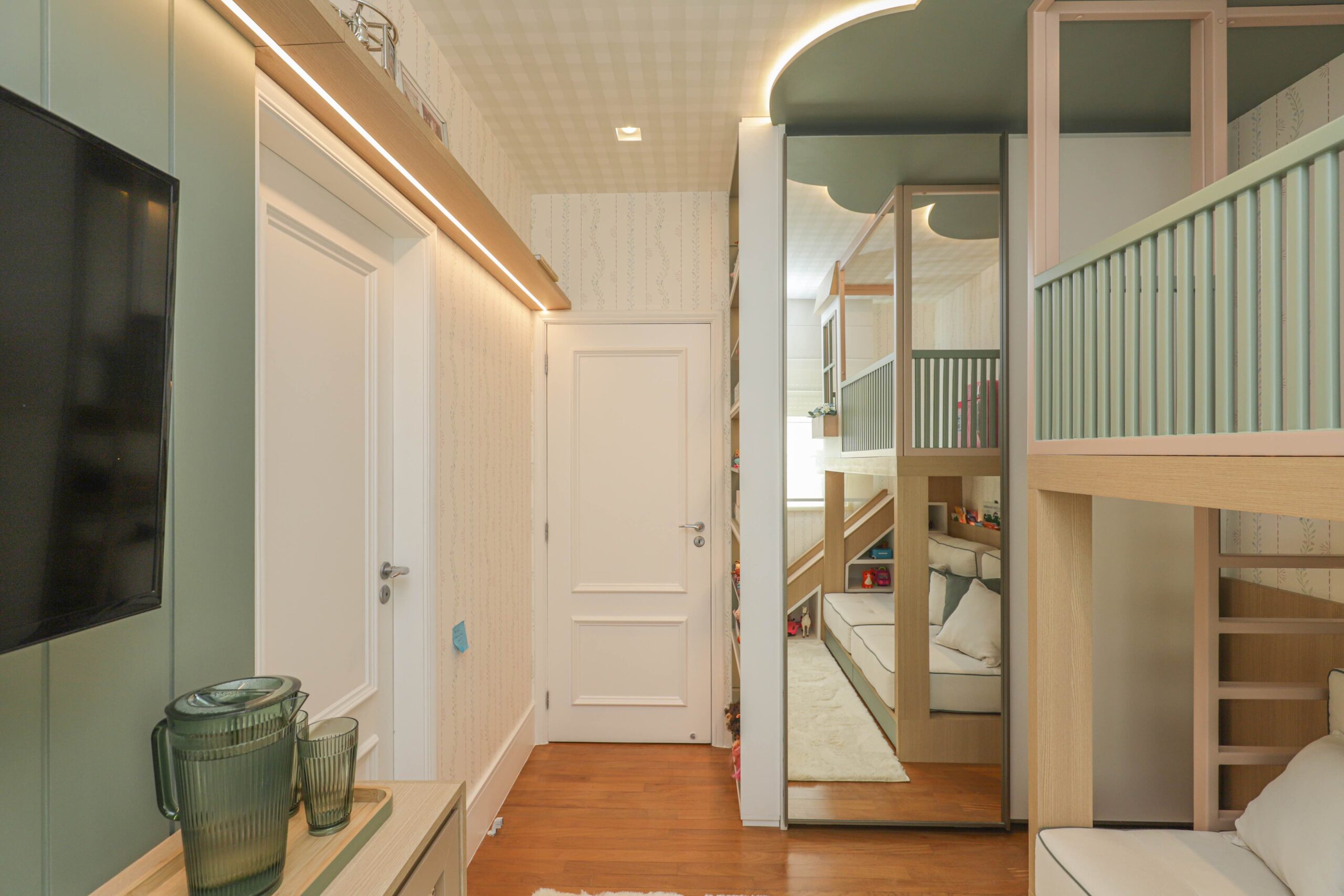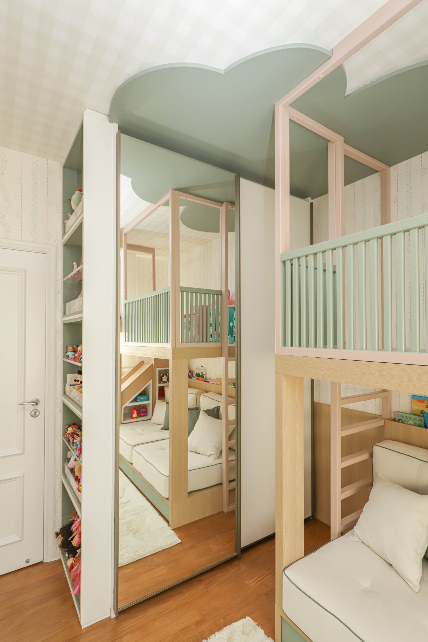 O espaço foi dividido em áreas cuidadosamente planejadas. A estrutura com mezanino traz um toque lúdico e oferece uma área elevada para brincadeiras mais tranquilas ou momentos de imaginação criativa. O cantinho inferior foi projetado para ser um confortável espaço de descanso,