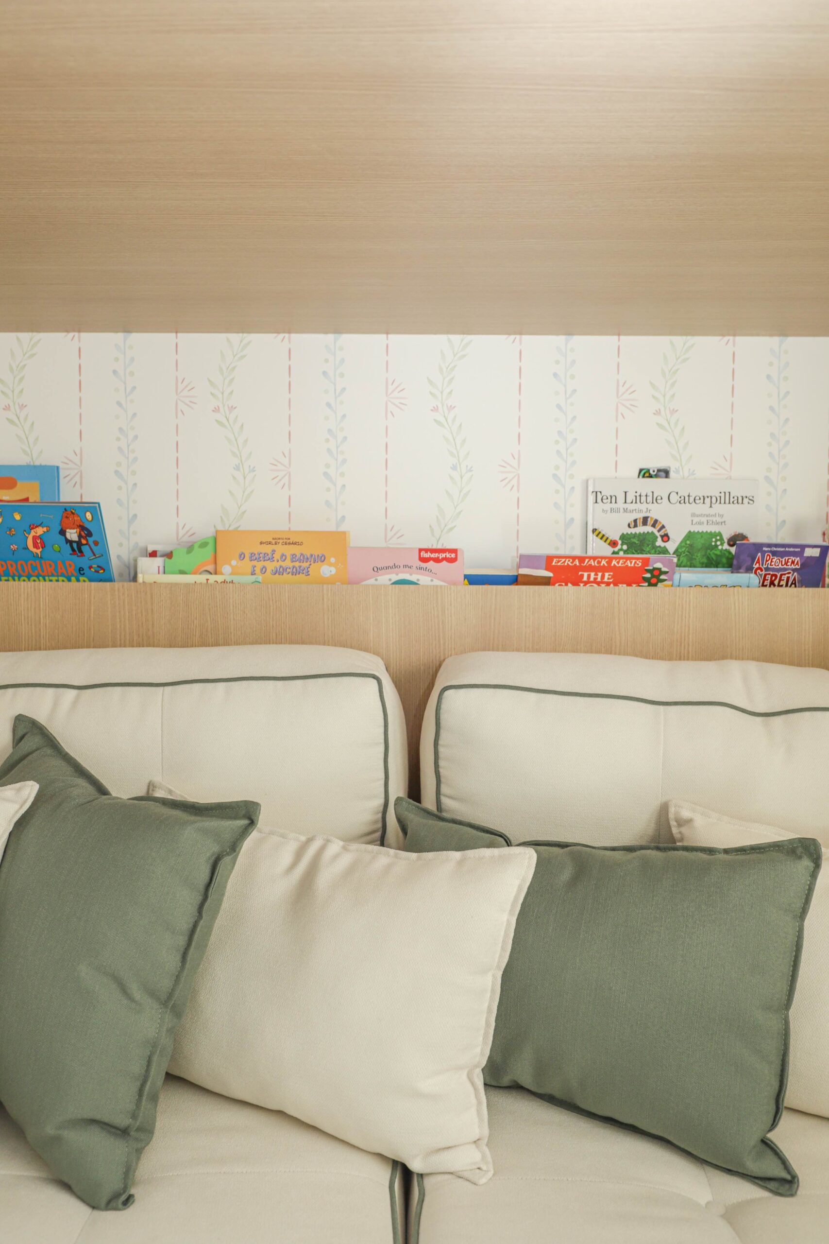 com almofadas macias que convidam a relaxar e se aconchegar, seja para ler, brincar ou aproveitar uma sessão de cinema em família.