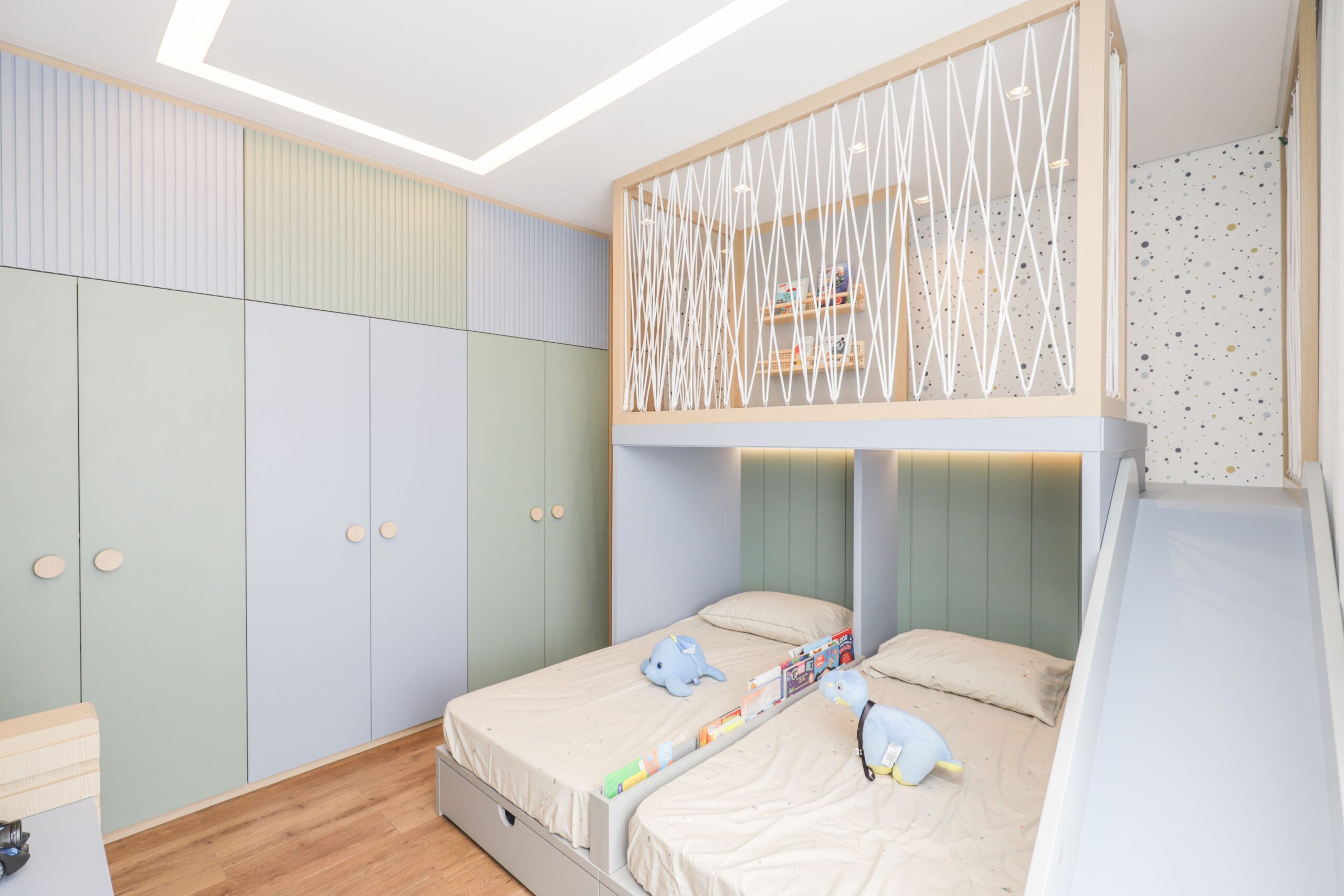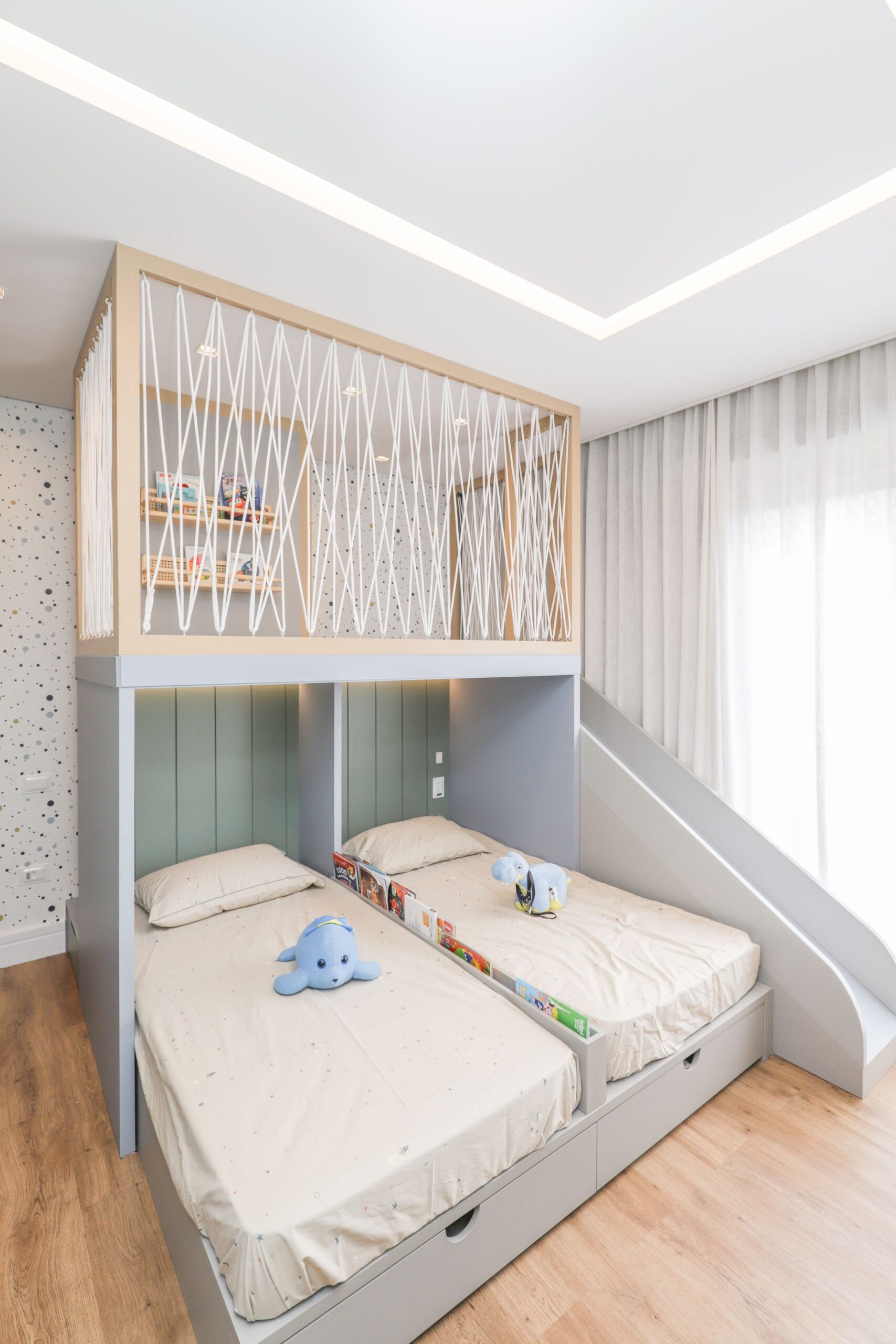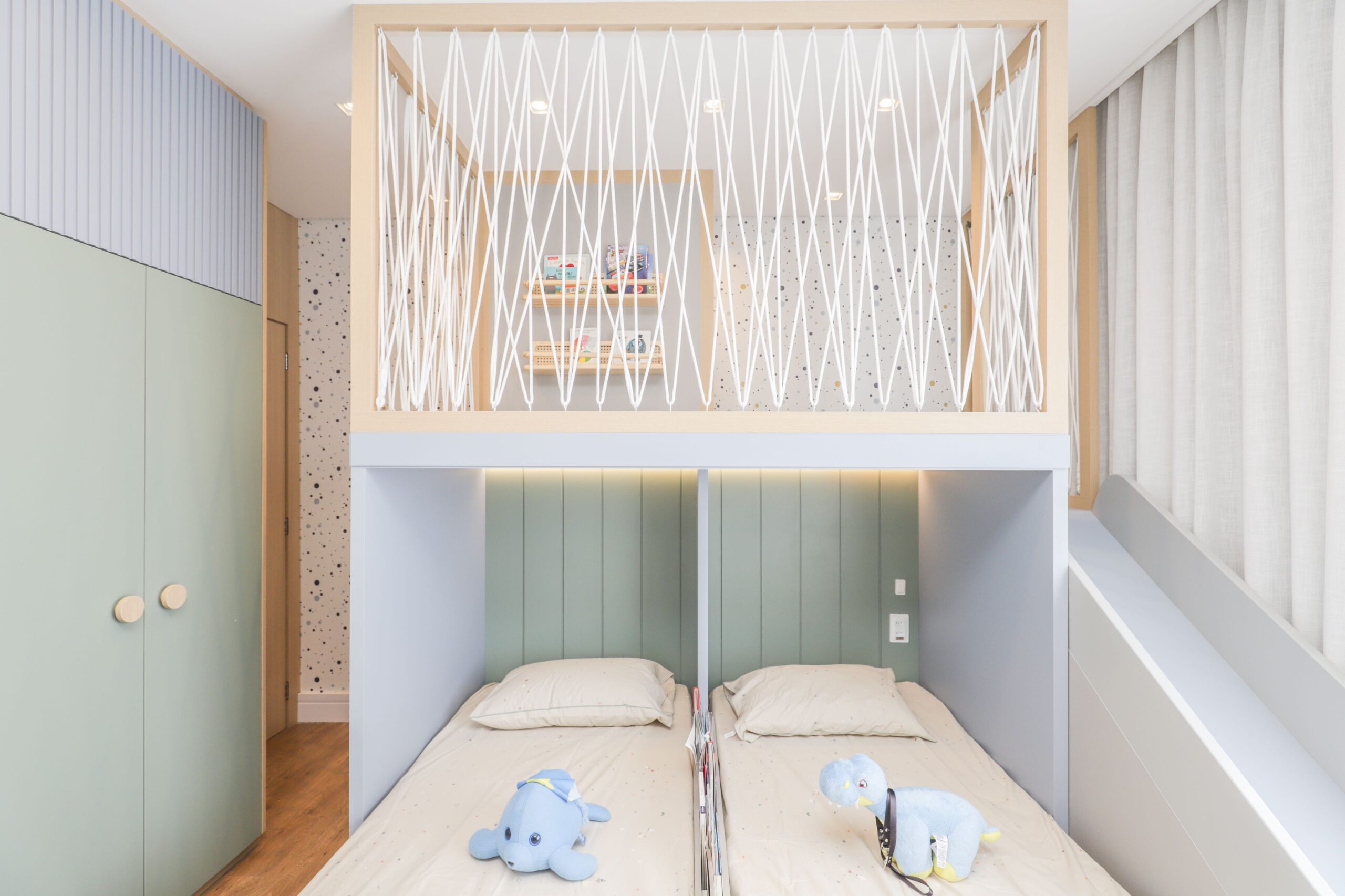 Este projeto combina estética, funcionalidade e conforto, criando um espaço que evolui com os irmãos e fortalece o vínculo entre eles. Um quarto pensado para crescer junto com seus pequenos habitantes.