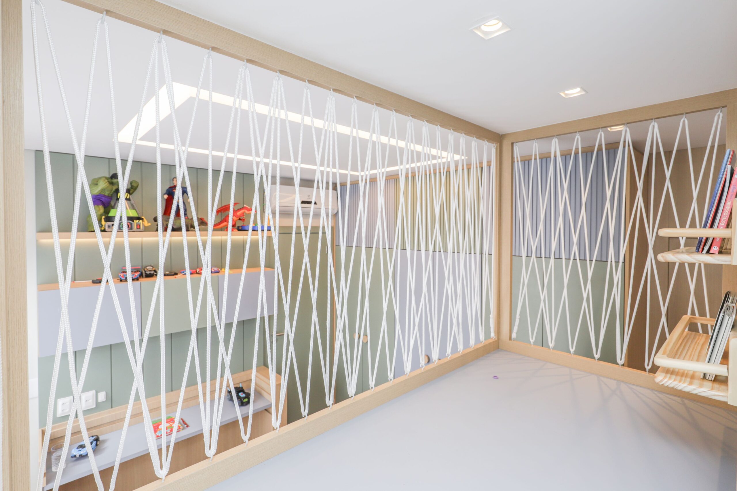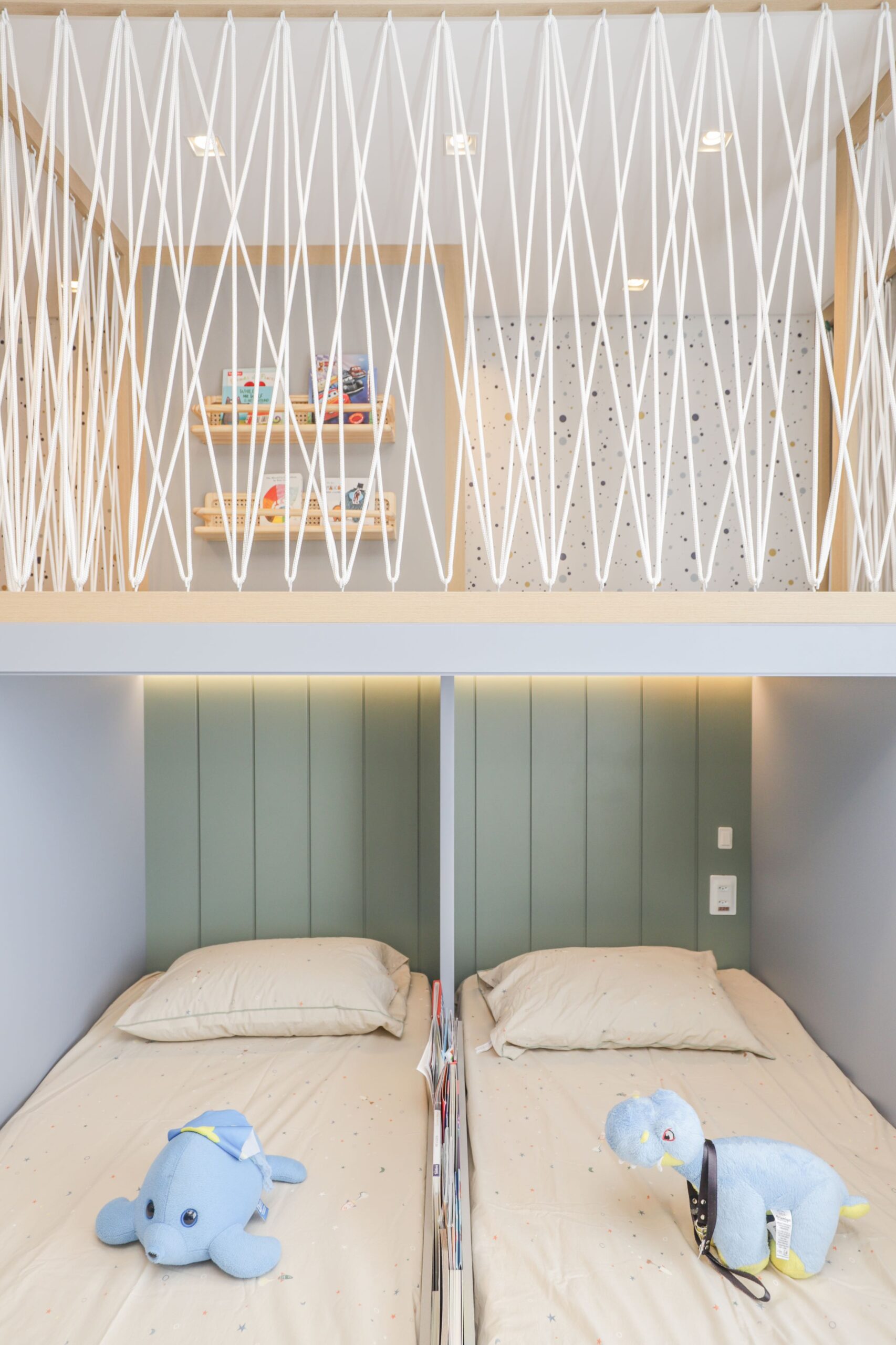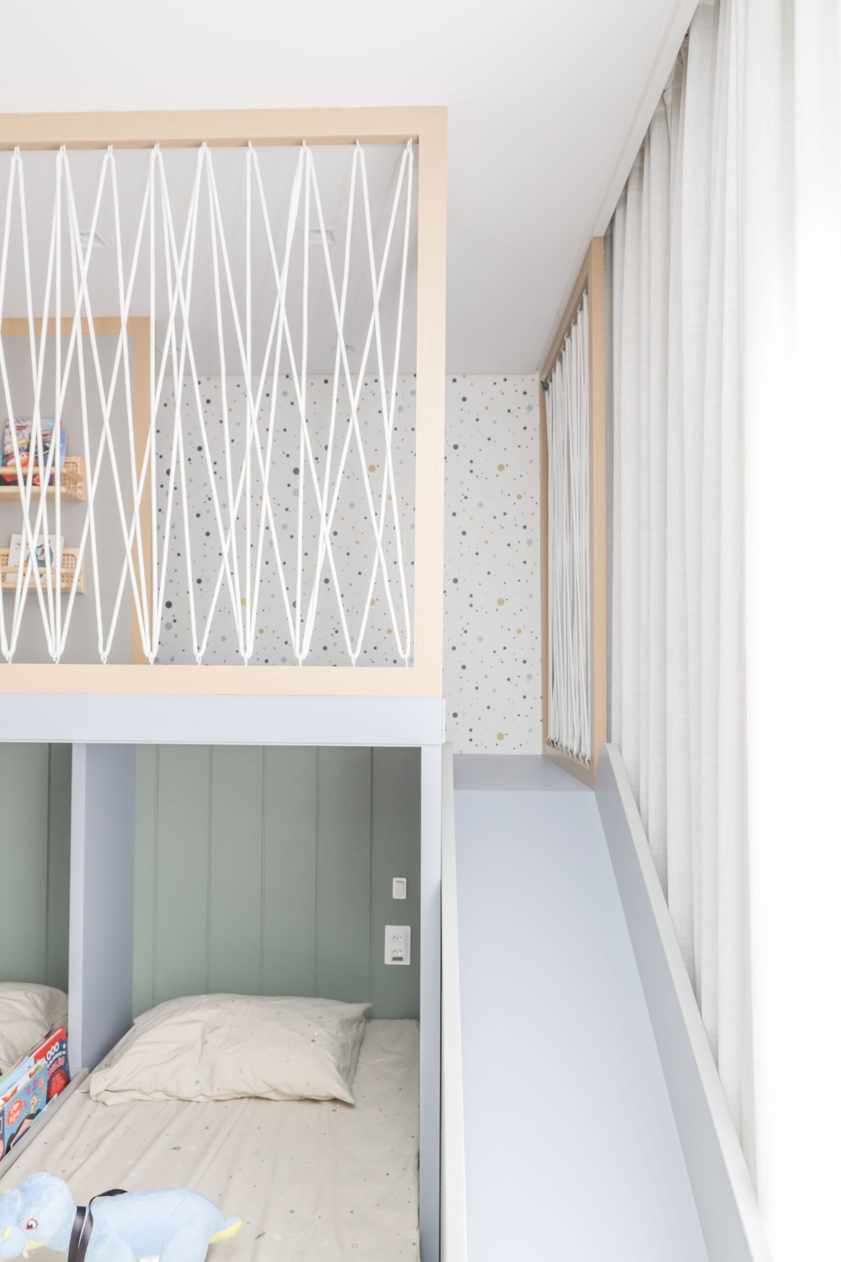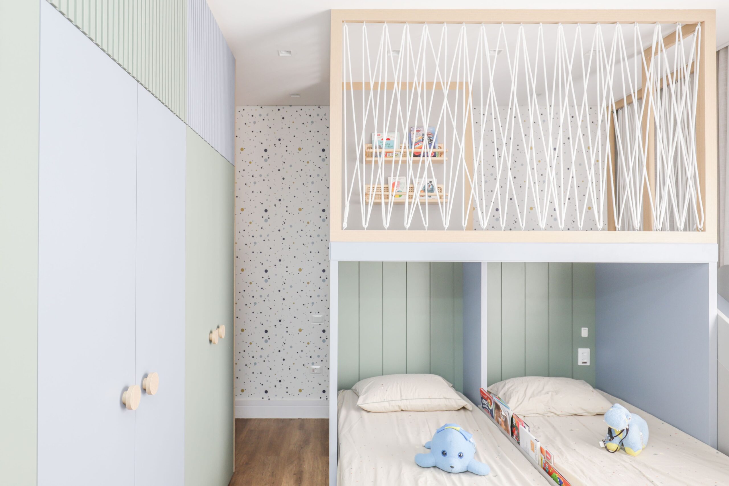 A cama beliche foi idealmente configurada para acomodar os pequenos com segurança e um toque de ludicidade. O mezanino, cercado por uma grade com cordas, oferece um espaço lúdico e seguro para brincadeiras, estimulando a criatividade dos irmãos. A escada lateral com degraus amplos e a área deslizante agregam um elemento divertido ao design.