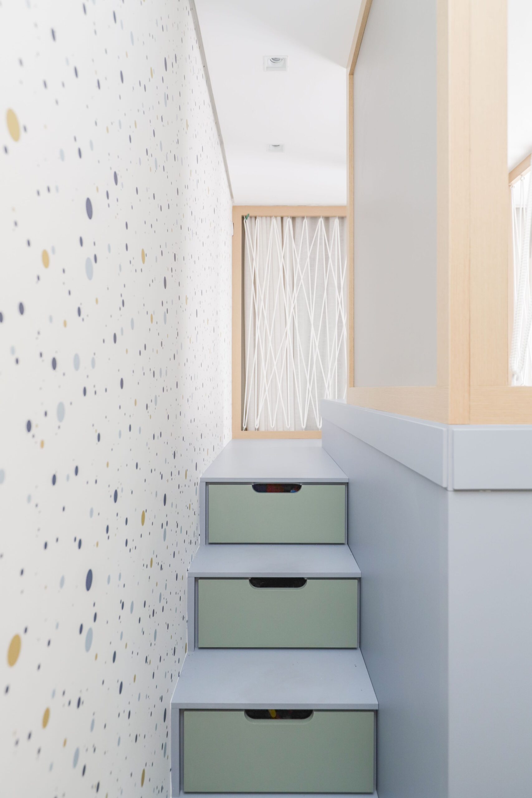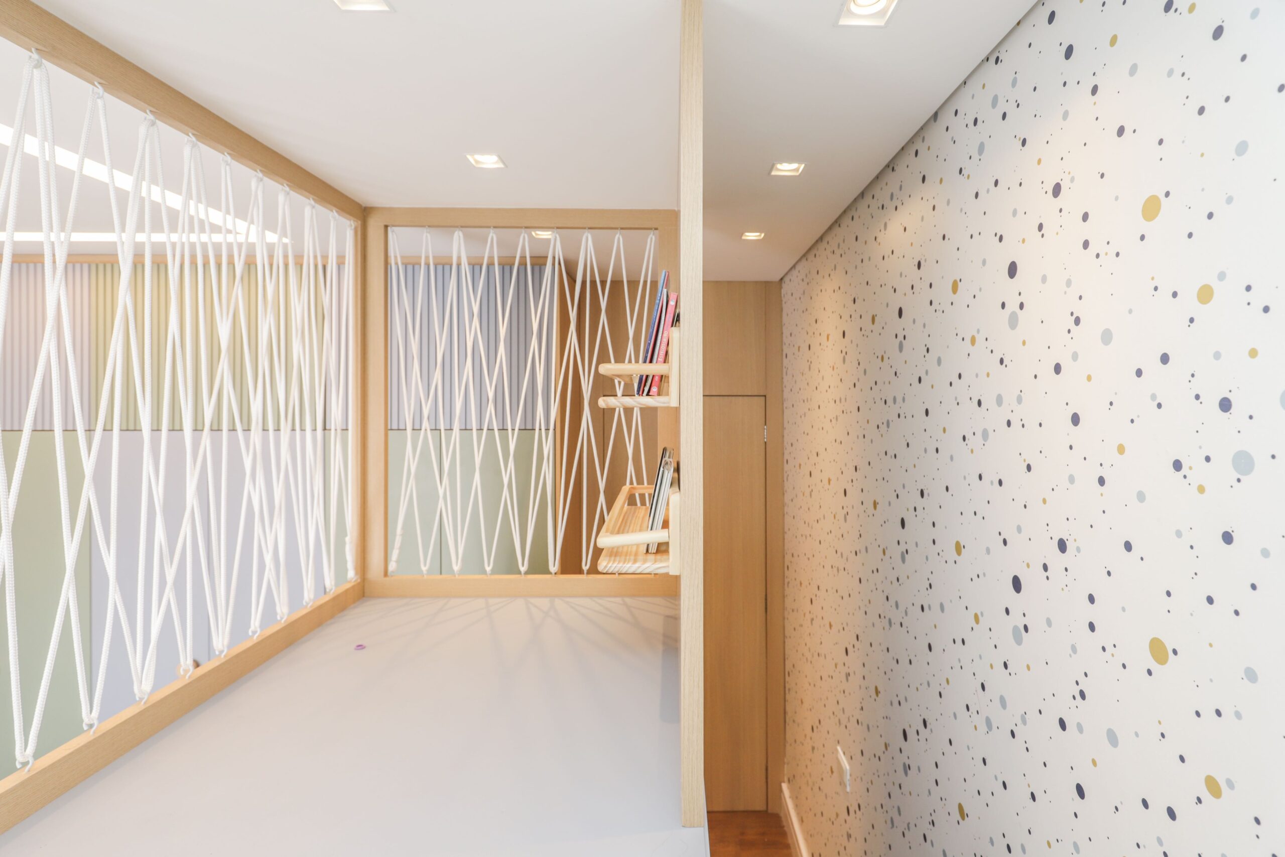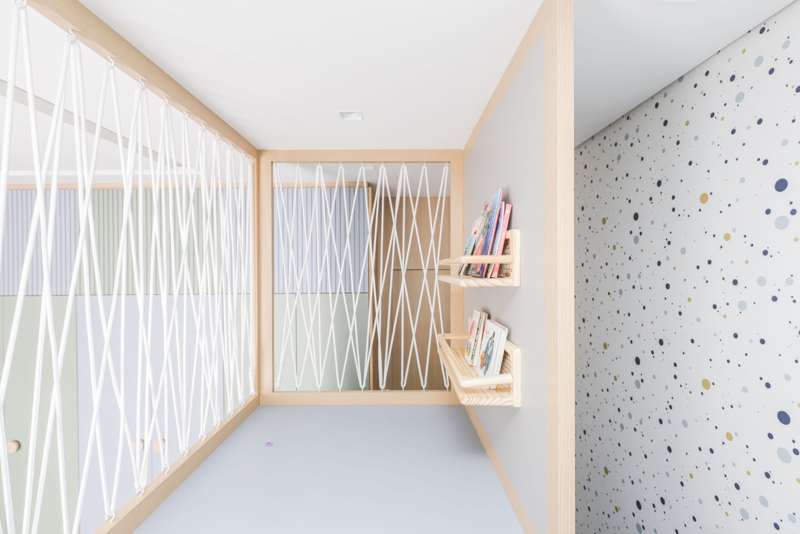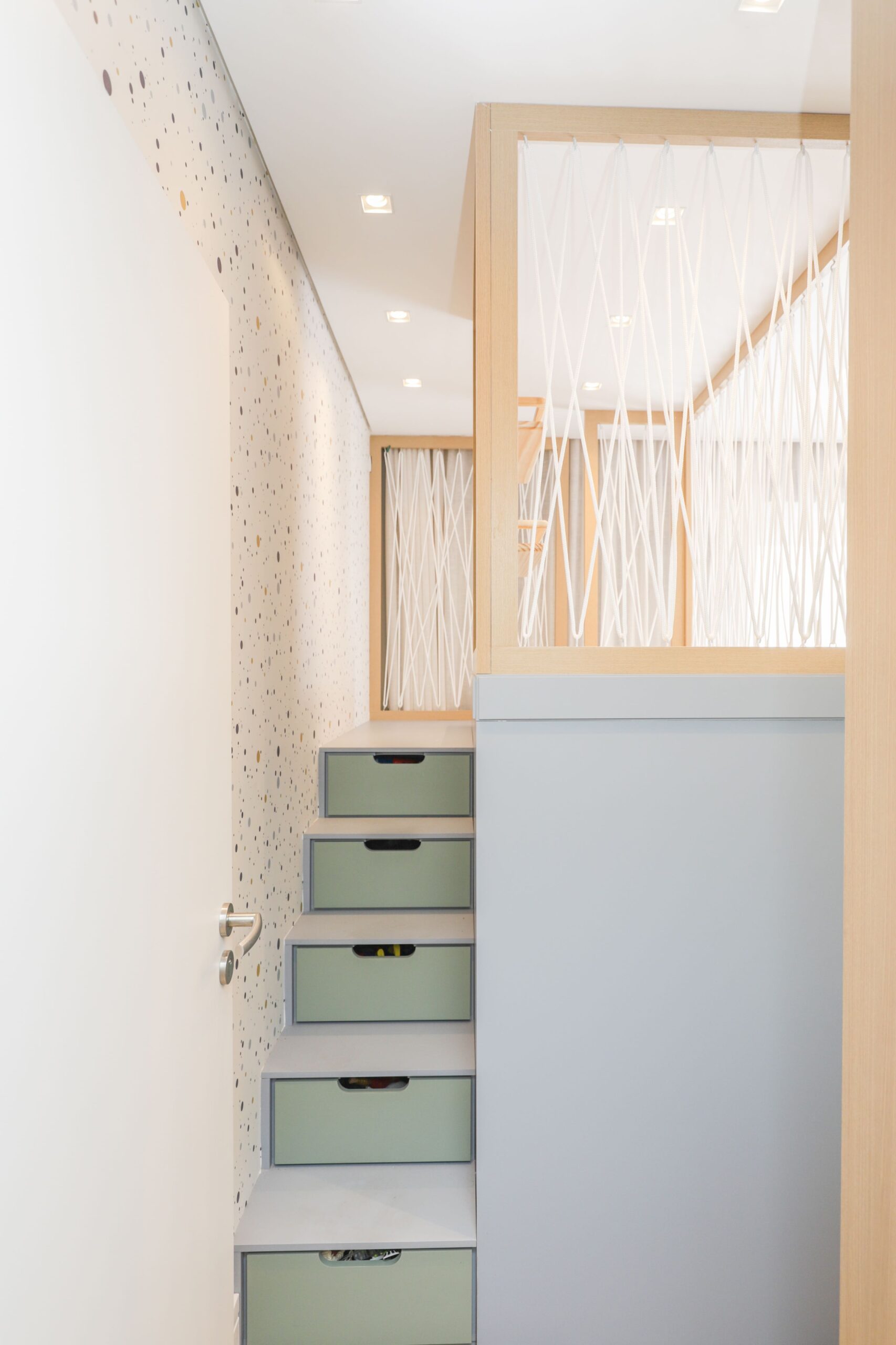 A cama beliche foi idealmente configurada para acomodar os pequenos com segurança e um toque de ludicidade. O mezanino, cercado por uma grade com cordas, oferece um espaço lúdico e seguro para brincadeiras, estimulando a criatividade dos irmãos. A escada lateral com degraus amplos e a área deslizante agregam um elemento divertido ao design.