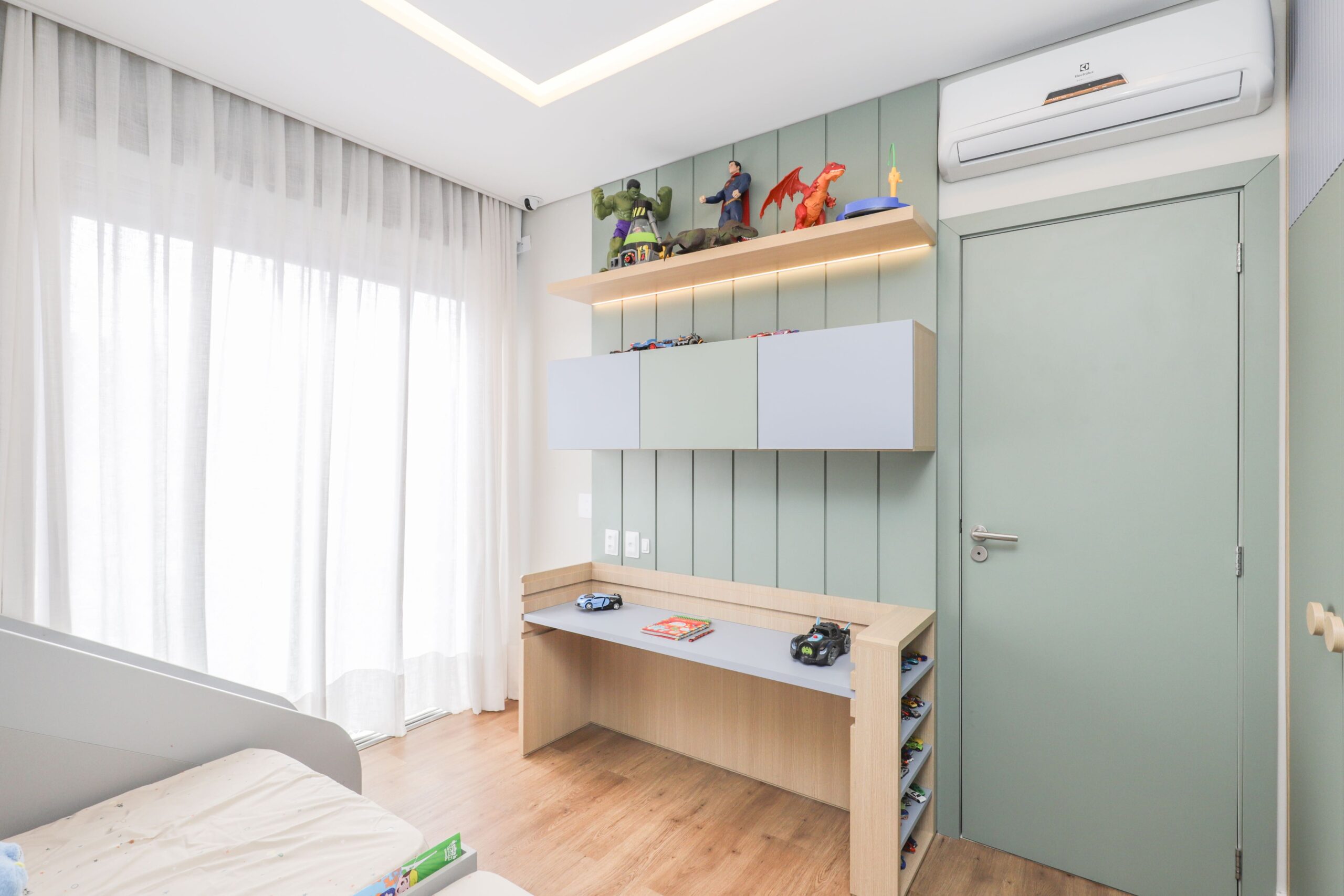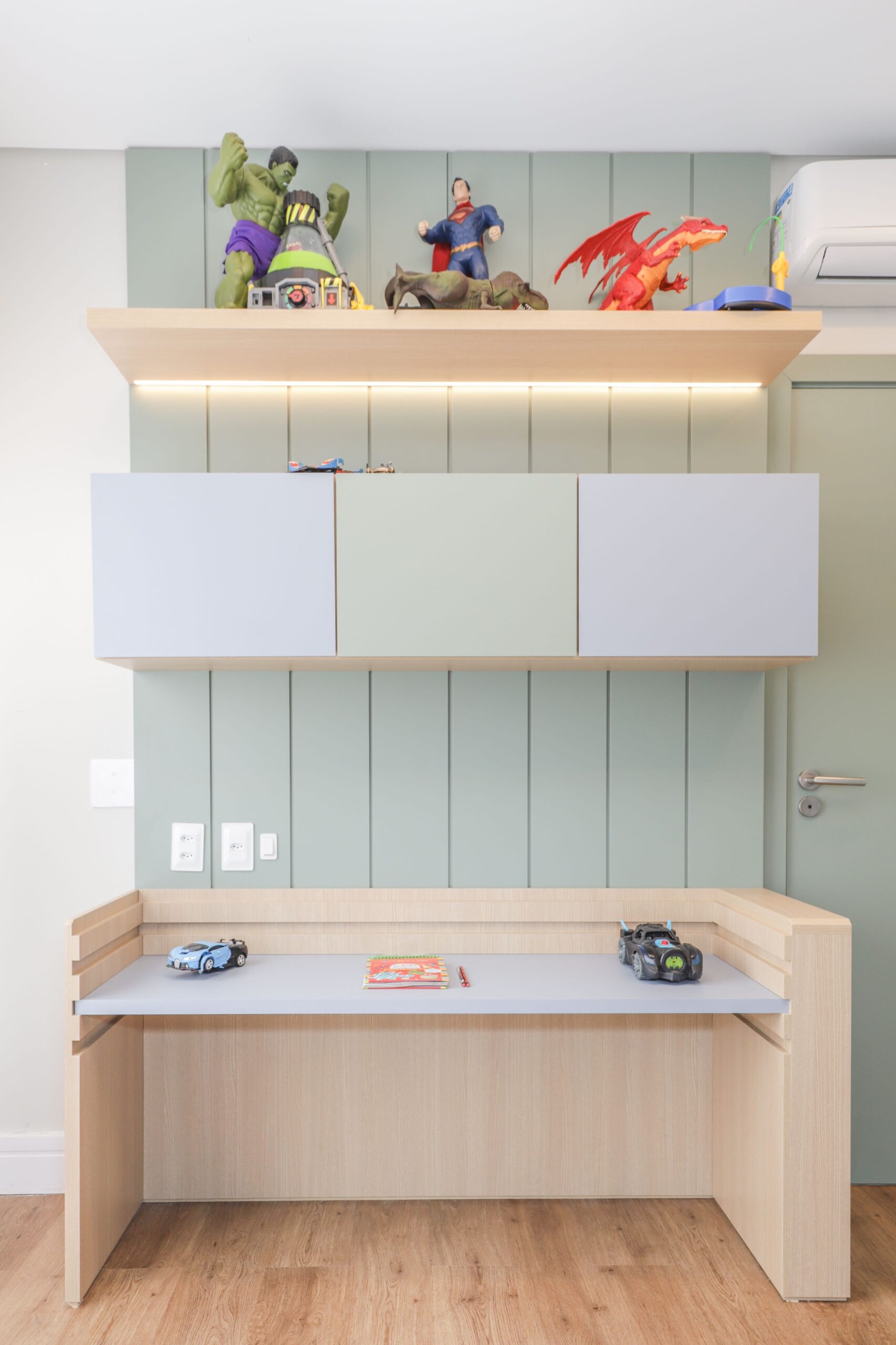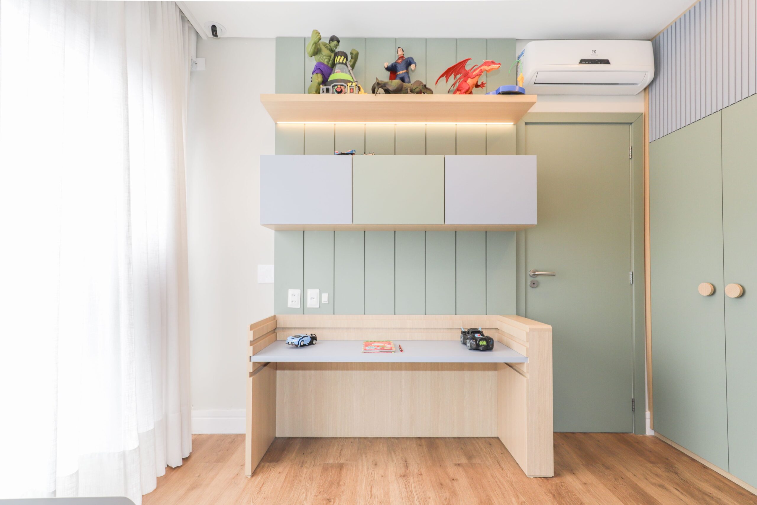 O espaço de estudo foi cuidadosamente planejado para o irmão mais velho, com uma mesa ergonômica e nichos que organizam os brinquedos e materiais de forma prática e acessível. O armário amplo, com detalhes arredondados, complementa o ambiente, oferecendo espaço de armazenamento funcional e seguro para as necessidades de ambas as crianças.