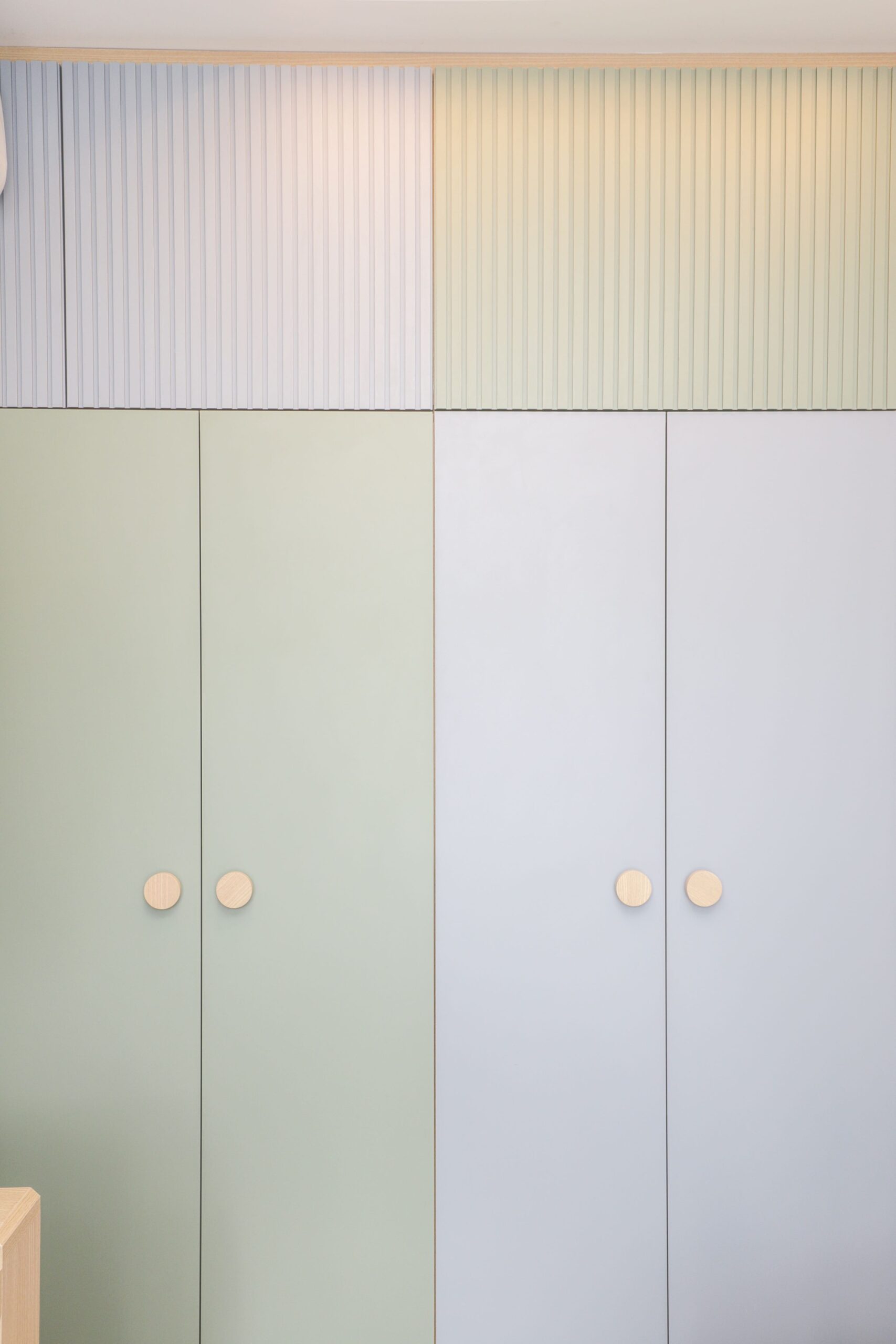 A paleta de cores em tons de verde, azul claro e madeira natural cria uma atmosfera tranquila e acolhedora, enquanto os painéis ripados e os móveis sob medida garantem um design sofisticado e atemporal.